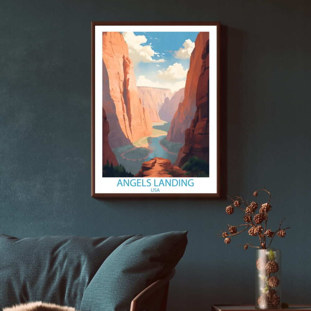 Plakat Angels Landing Park Narodowy Zion USA Stany Zjednoczone to elegancka dekoracja ścienna, która wniesie do Twojego wnętrza niepowtarzalny klimat. Wykonany z najwyższą dbałością o detale, łączy artystyczny design z profesjonalną jakością druku.