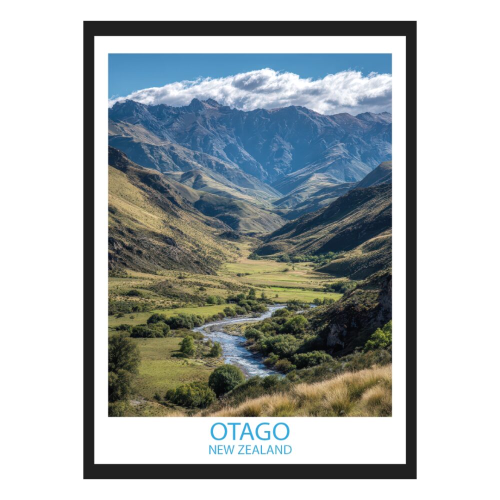 Plakat „Rzeka Clutha i Szczyty Southern Alps” | Nowa Zelandia – dekoracja premium. Profesjonalny wydruk, trwały papier 200g/m². Rozmiary: 30×40, 40×50, 50×70.