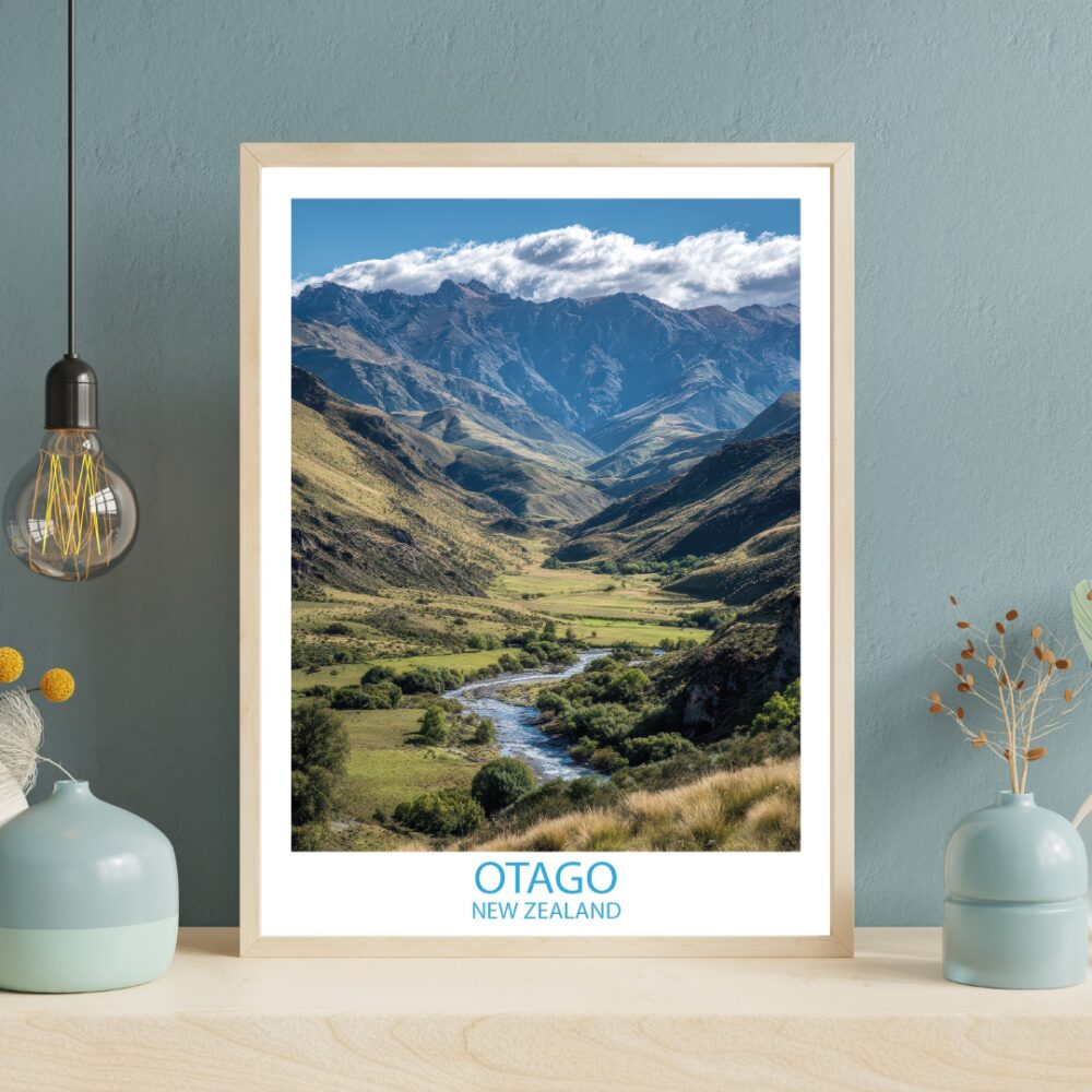 Plakat „Rzeka Clutha i Szczyty Southern Alps” | Nowa Zelandia to elegancka dekoracja ścienna, która wniesie do Twojego wnętrza niepowtarzalny klimat. Wykonany z najwyższą dbałością o detale, łączy artystyczny design z profesjonalną jakością druku.